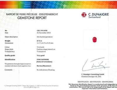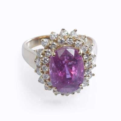 centering an oval-cut pink sapphire weighing 8.73 carats, surrounded by two rows of round brilliant-cut diamonds; estimated total diamond weight: 1.00 carat.