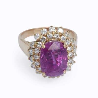 A pink sapphire, diamond, and fourteen karat gold ring