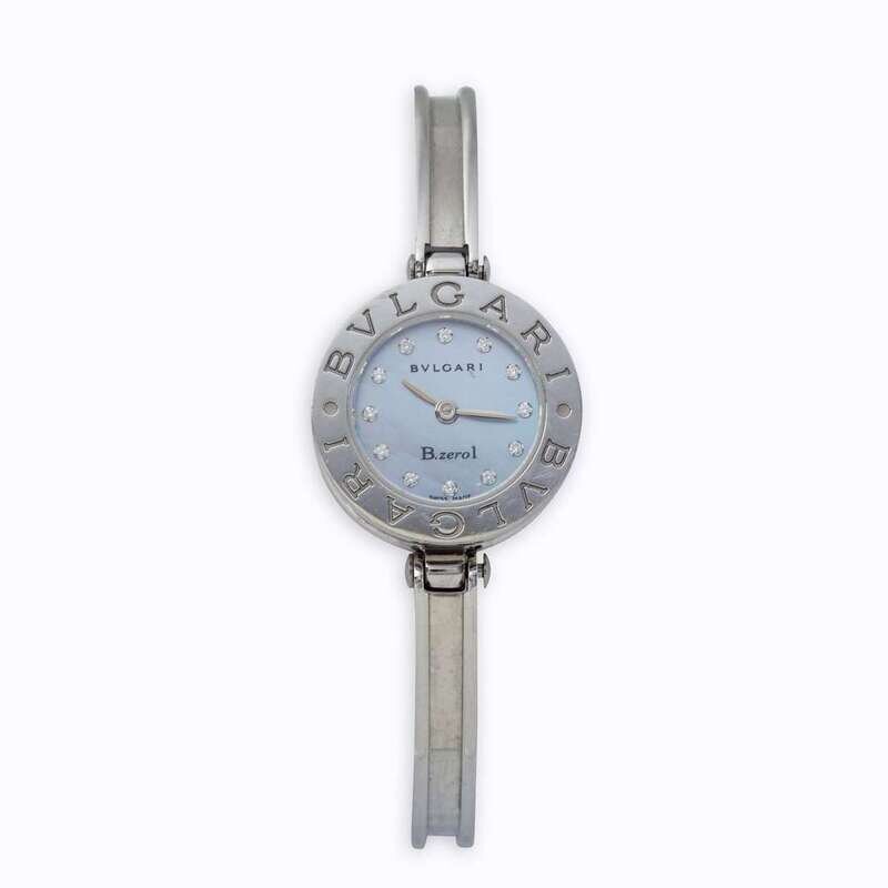 quartz movement, reference BZ 22 S, case number D143879, mother-of-pearl dial with circular-cut diamond numerals and completed by a signature Bvlgari bangle with foldover clasp.