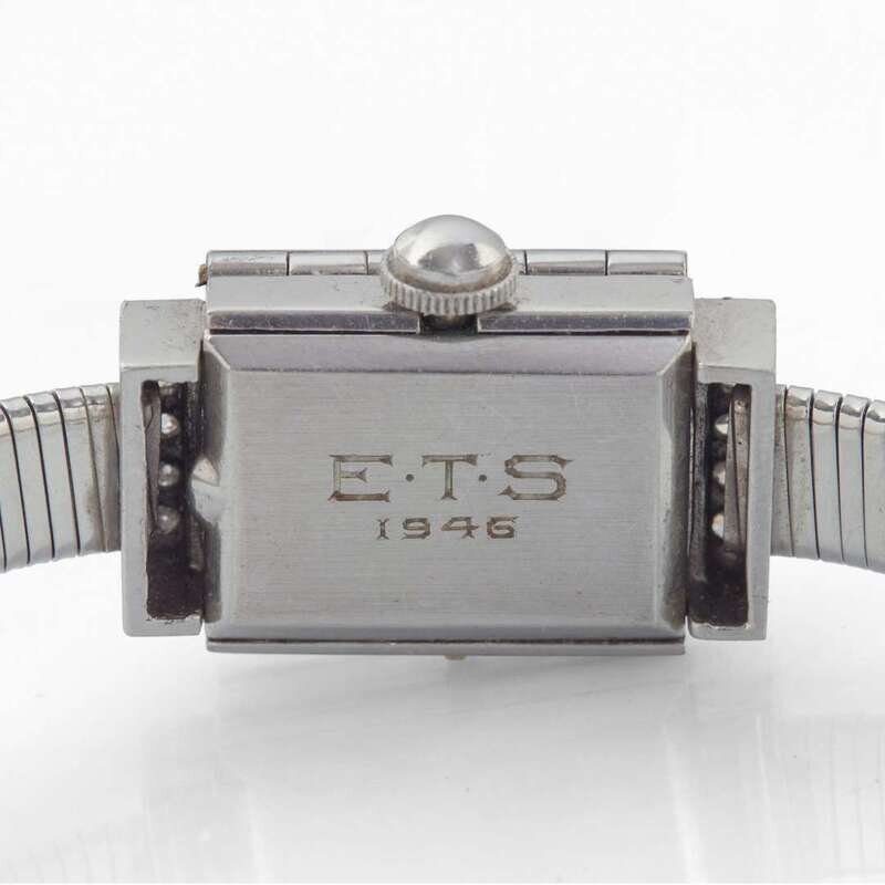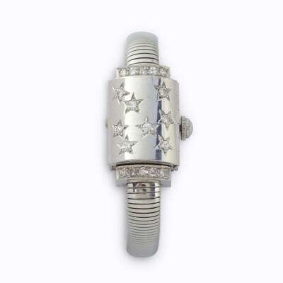 17 jewel movement, case number 668220, covered dial and shoulders set with round brilliant and single-cut diamonds, completed by a tubogas style flexible bracelet with foldover clasp.