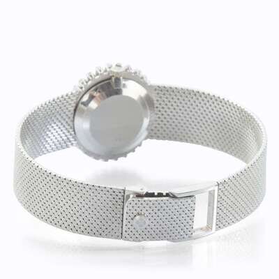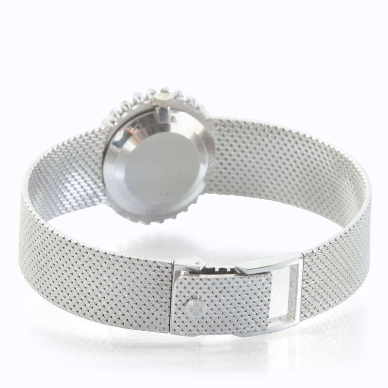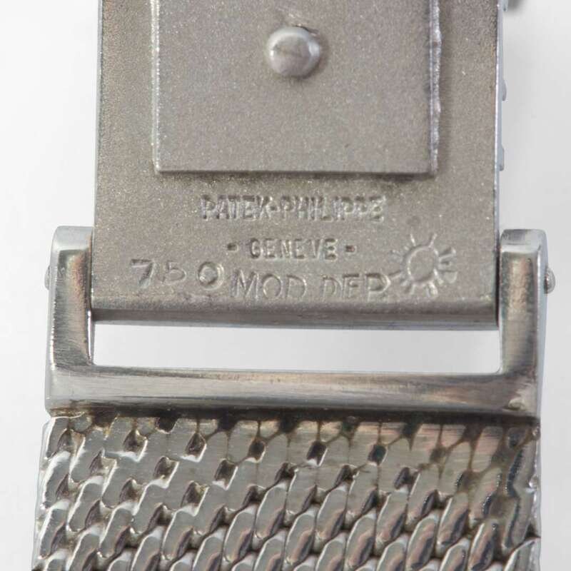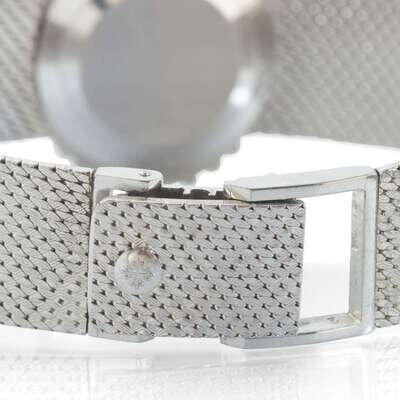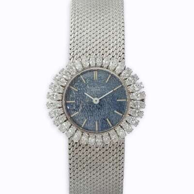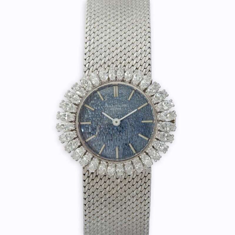 20 jewel movement 992862, reference 3357/3, case number 265954, dark blue textured dial with baton hands and numerals, case is bezel set with thirty-two marquise-shaped diamonds; estimated total diamond weight: 1.20 carats, attached to a Patek Philippe eighteen karat white gold mesh bracelet with foldover clasp.