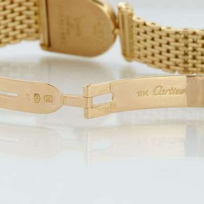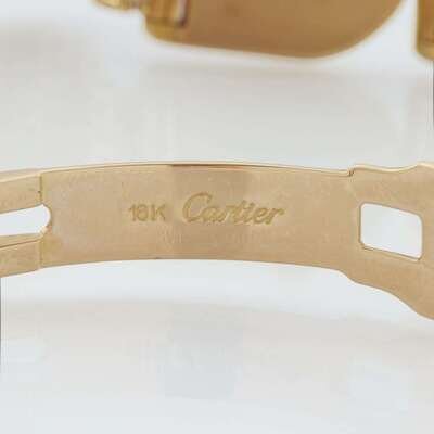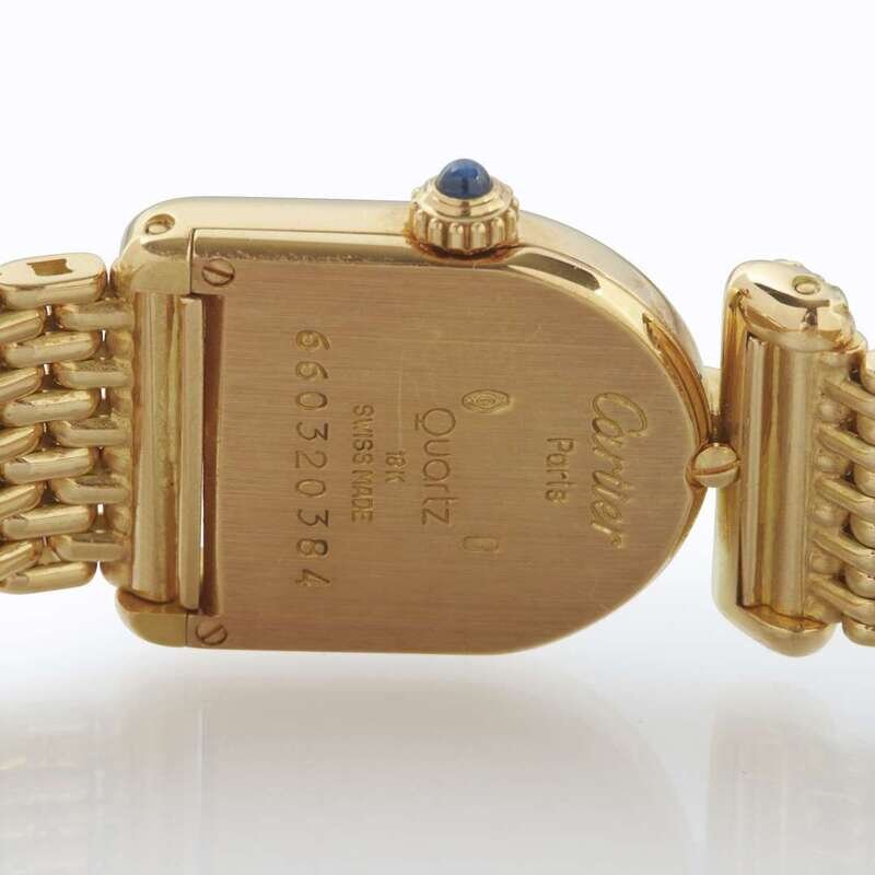 quartz movement, case number 660320384, white dial with baton hands, Roman numerals, and secret signature at 10 o'clock, attached to original Cartier gold bracelet and hidden deployant clasp, lug set with single-cut diamonds.