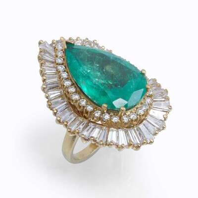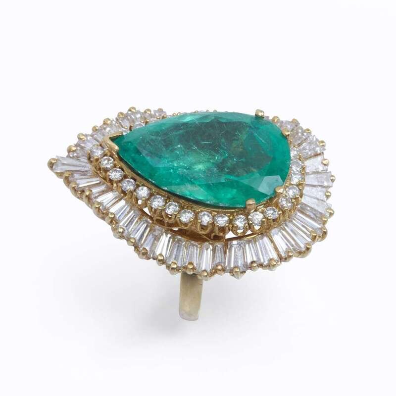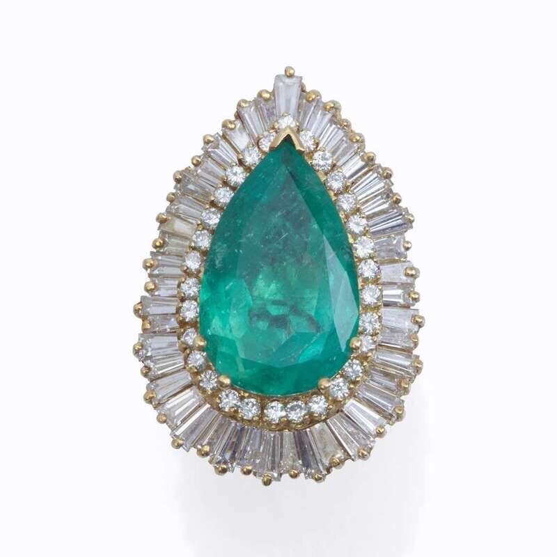 set with a pear-shaped emerald weighing approximately 9.50 carats, surrounded by round and tapering baguette-cut diamonds; estimated total diamond weight: 3.15 carats, mounted in eighteen karat gold "ringdant" setting.