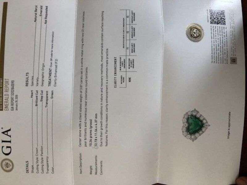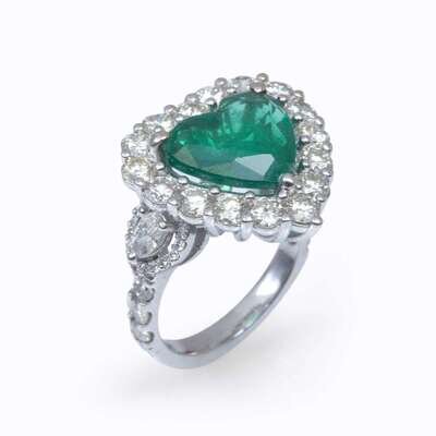centering a heart-shaped emerald weighing 3.87 carats, accented by round brilliant and pear-shaped diamonds; estimated total diamond weight: 2.70 carats.
