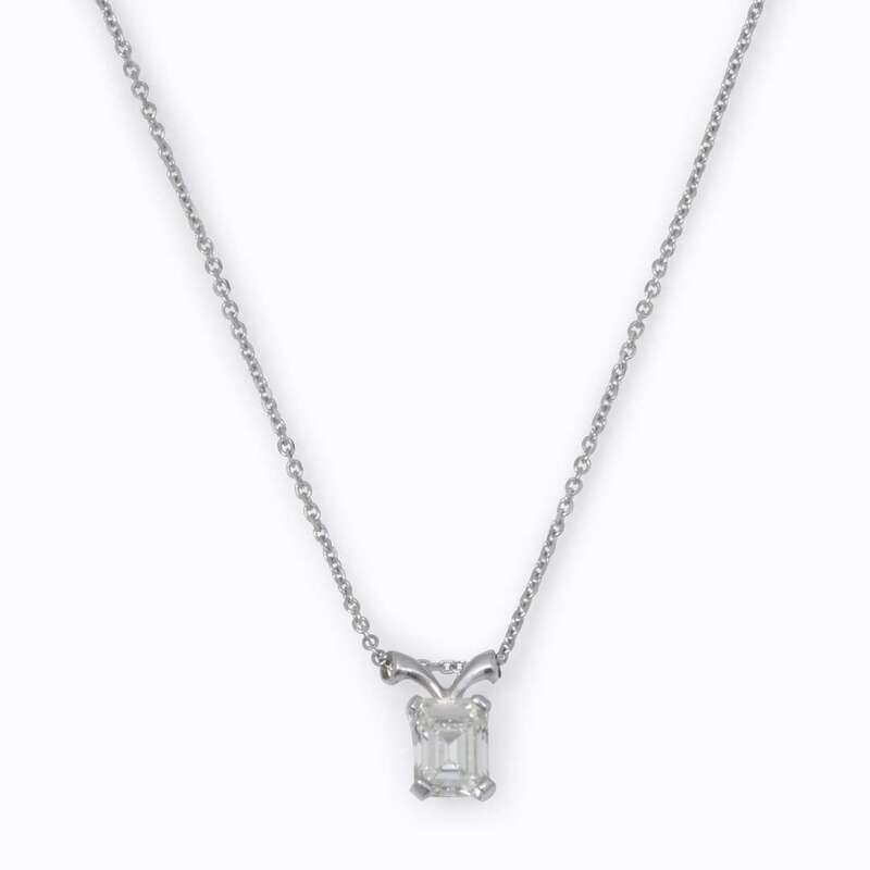 centering an emerald-cut diamond weighing approximately 1.60 carats, mounted in platinum, suspending from a fourteen karat white gold chain.