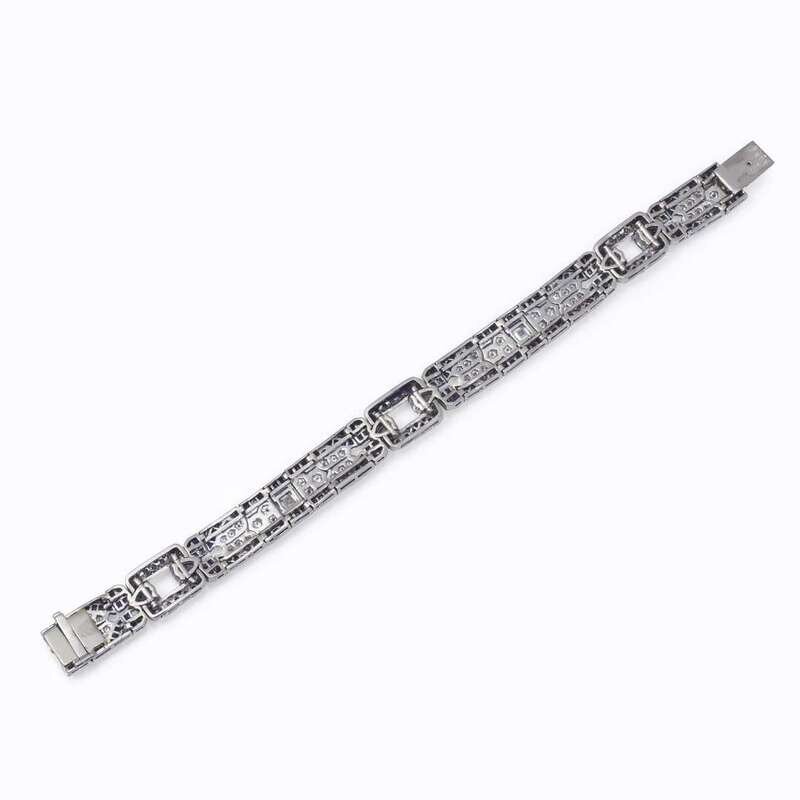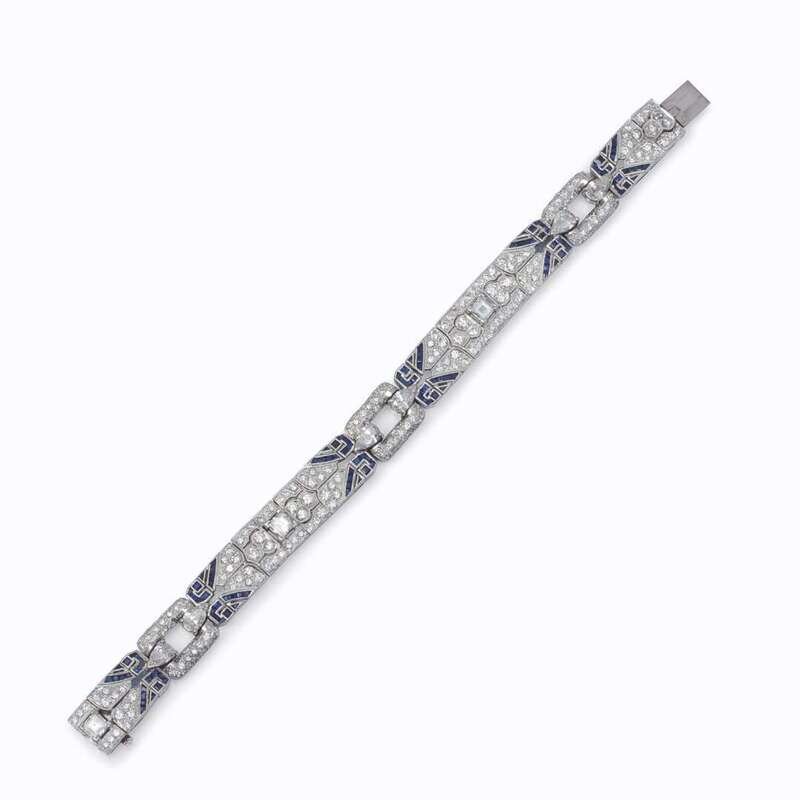 designed as sections of rectangular shaped pavé-set diamond links, joined by pear-shaped diamonds accented by square-cut diamonds; total diamond weight: 10.87 carats, accented by small calibré-cut sapphires.