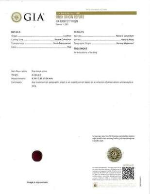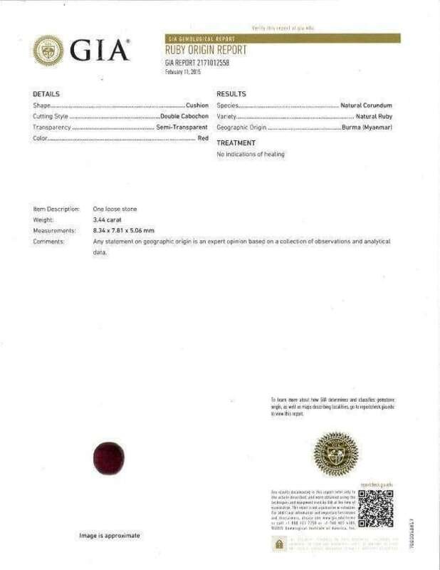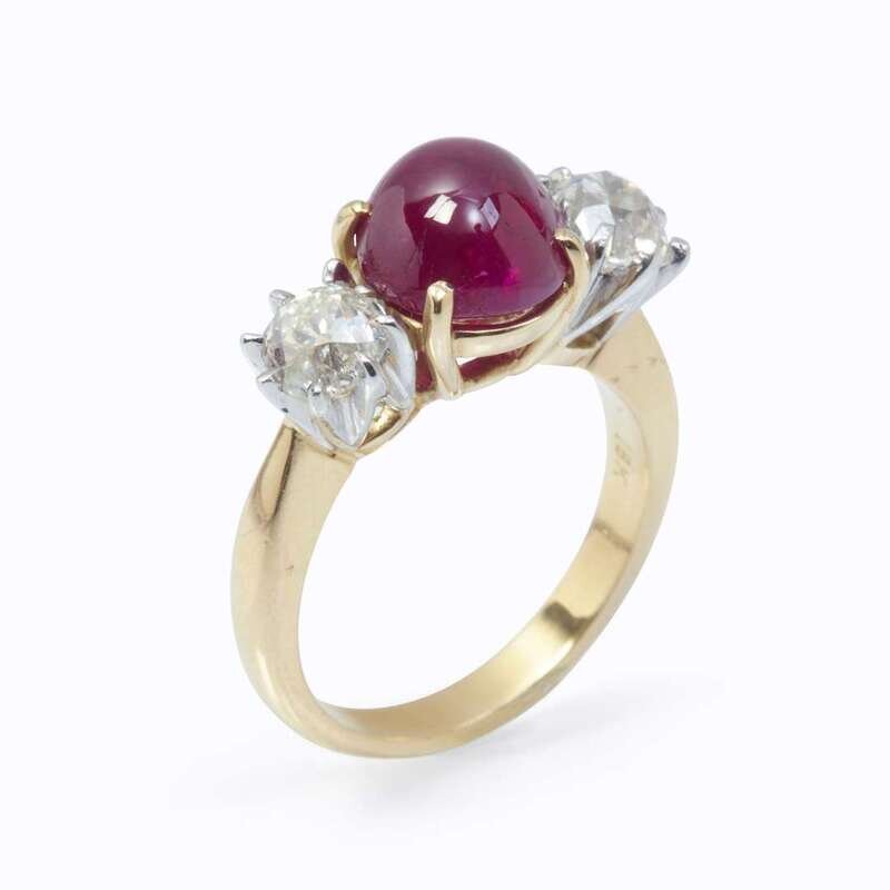 centering an oval cabochon Burma ruby weighing 3.44 carats, flanked by old mine-cut diamonds; estimated total diamond weight: 1.30 carats.