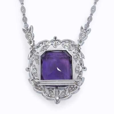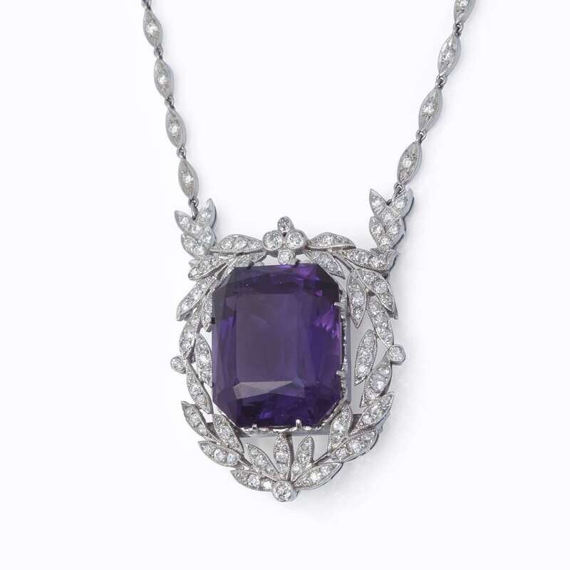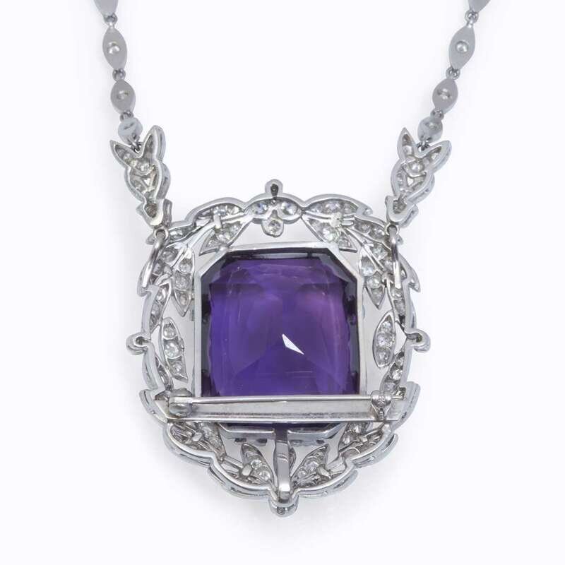 designed as a rectangular cut-corner amethyst measuring approximately 25mm x 20.8mm x 13.8mm, framed by old mine-cut diamond garland, on later chain; estimated total diamond weight: 7.70 carats.