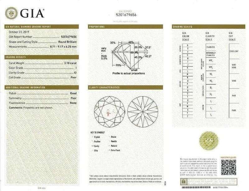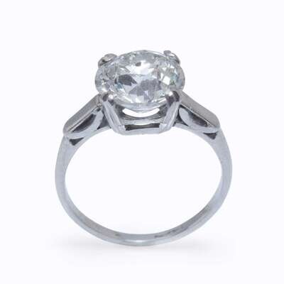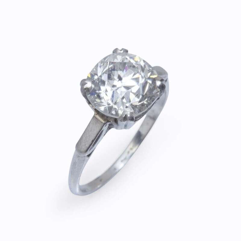 centering a round brilliant-cut diamond weighing 3.18 carats, mounted in platinum.