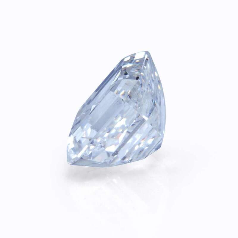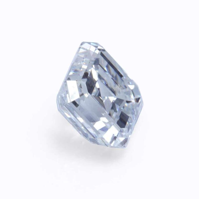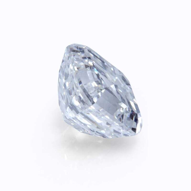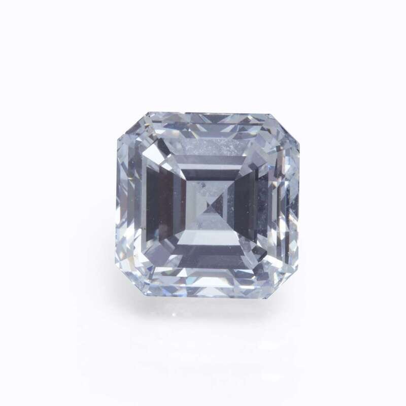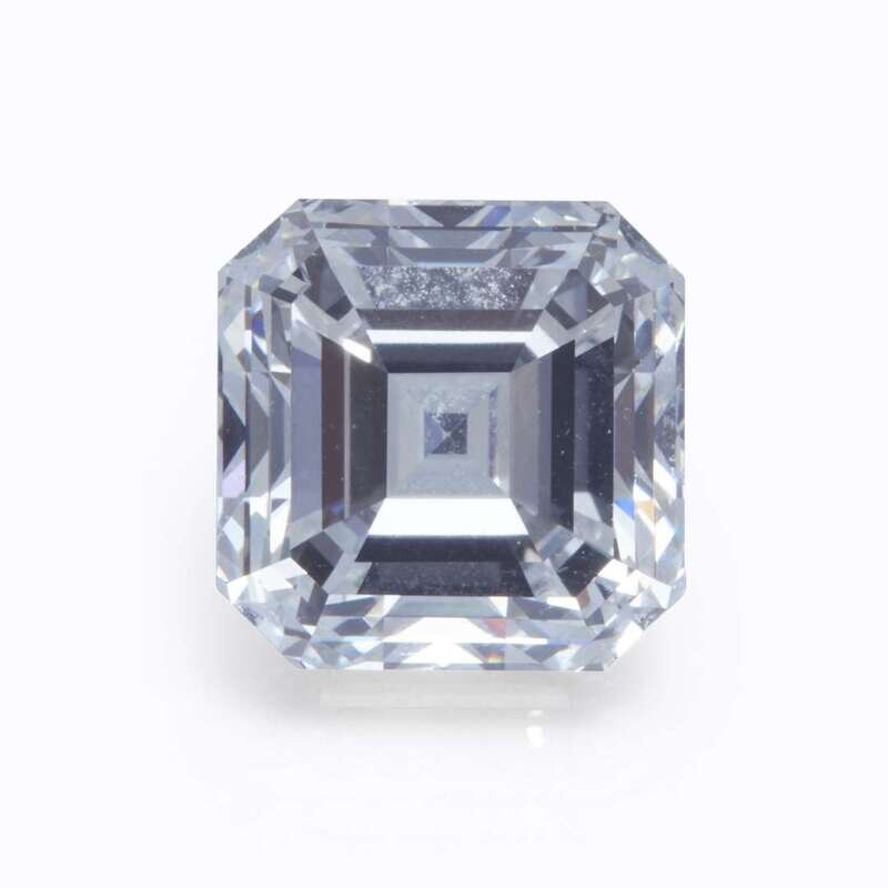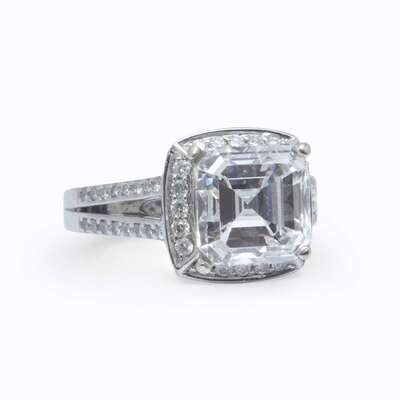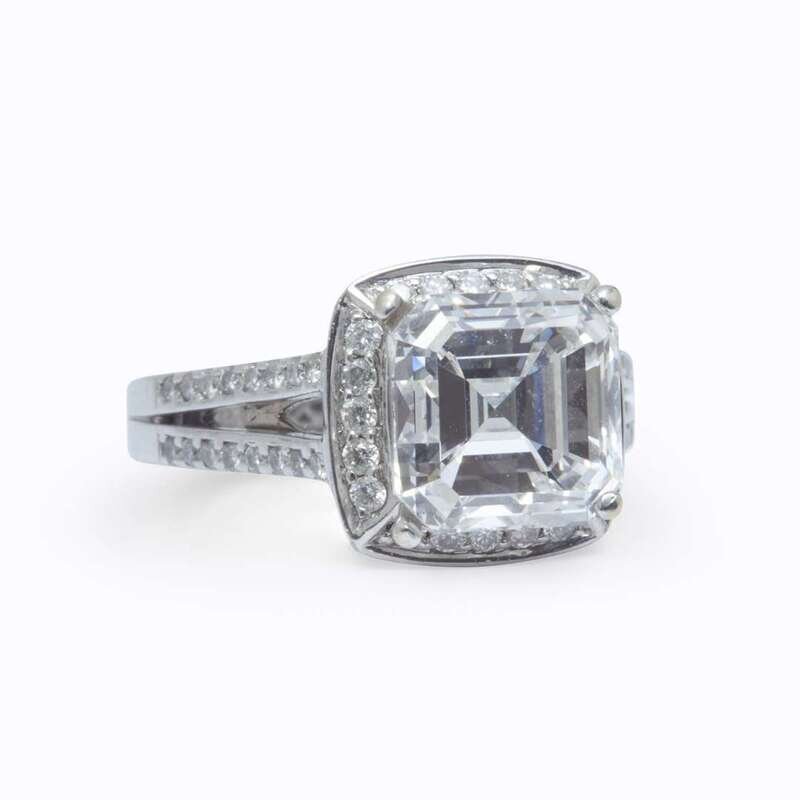 centering a square emerald-cut diamond weighing 5.56 carats, accented by round brilliant-cut diamonds, mounted in eighteen karat white gold.