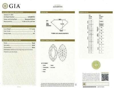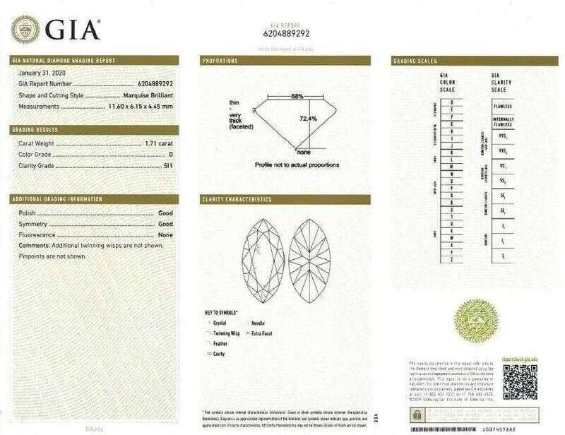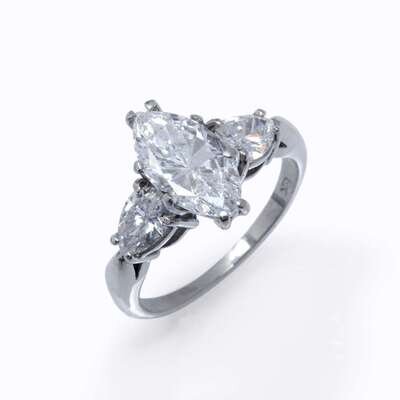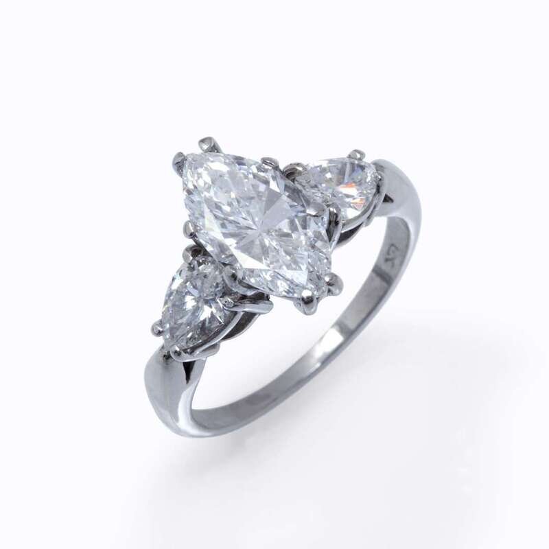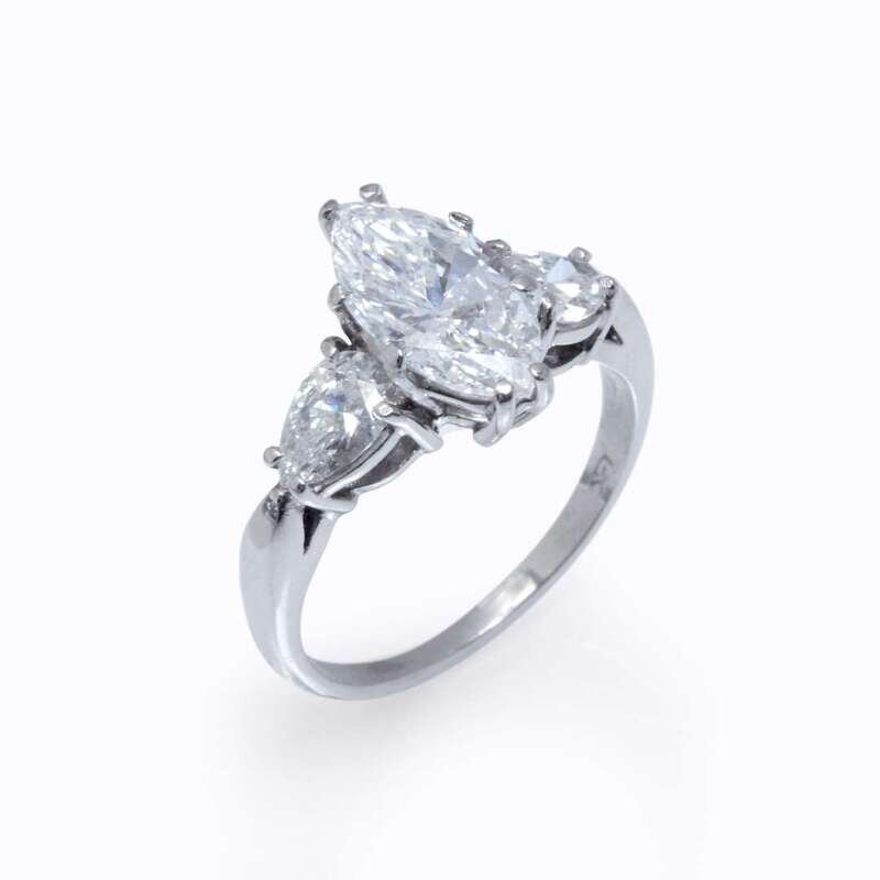 centering a marquise-cut diamond weighing 1.71 carats, flanked by pear-shaped diamonds; estimated total diamond weight: 0.80 carats.