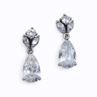 designed as pear-shaped diamond drops, weighing approximately 1.20 and 1.10 carats each, suspending from round and marquise-cut diamond surmount.