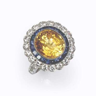 centering an oval-cut yellow sapphire weighing approximately 5.50 carats, surrounded by a row of calibré-cut sapphires, further surrounded by round brilliant-cut diamonds; estimated total diamond weight: 1.40 carats.
