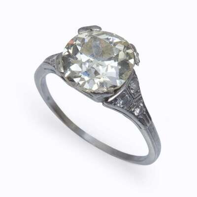 centering an old European-cut diamond weighing 3.20 carats, flanked by old European-cut diamonds, mounted in platinum.