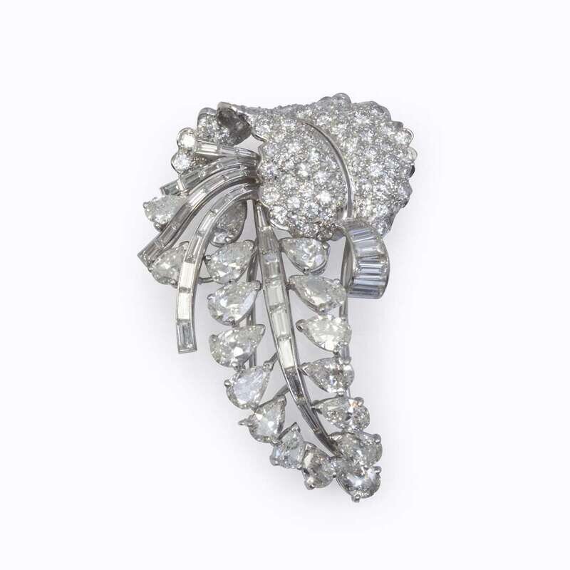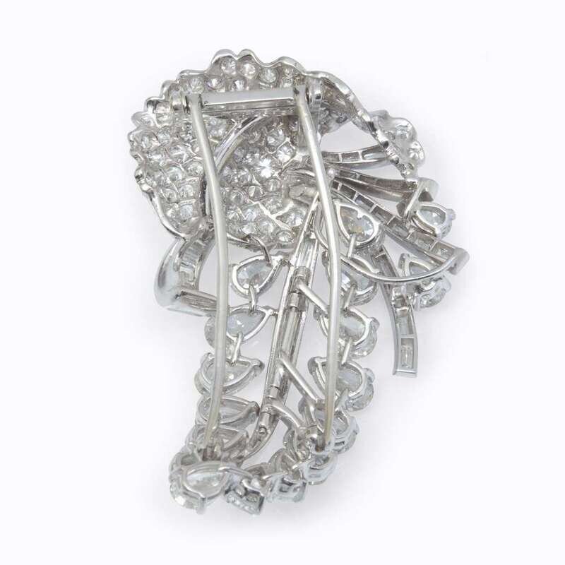 floral motif set with pear-shaped, pavé-set round brilliant, and channel-set baguette-cut diamonds; estimated total diamond weight: 12.00 carats.