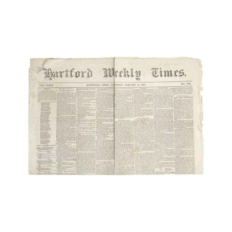 Hartford: January 13, 1855. Presumed first American appearance in print. Folio. 4 pp. "Hartford Weekly Times" (Vol. XXXIX), including a printing of Tennyson's poem "The Charge of the Light Brigade at Balaklava" on the front page. With some light wear and short closed tears to extremities, small paper loss to upper left corner.