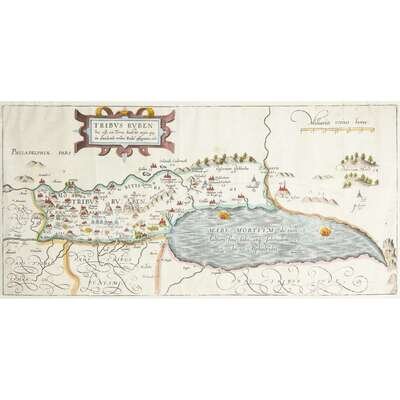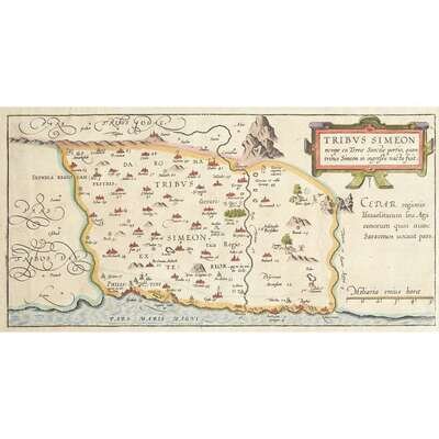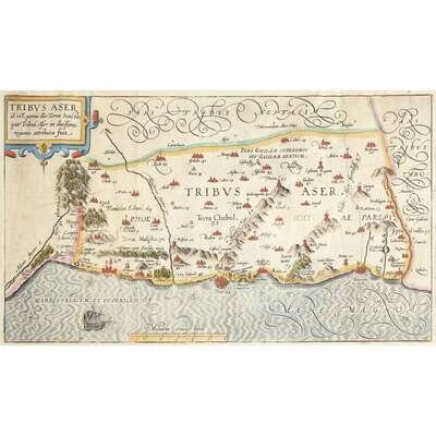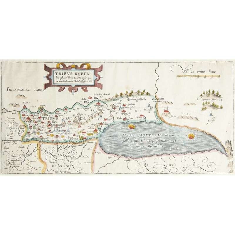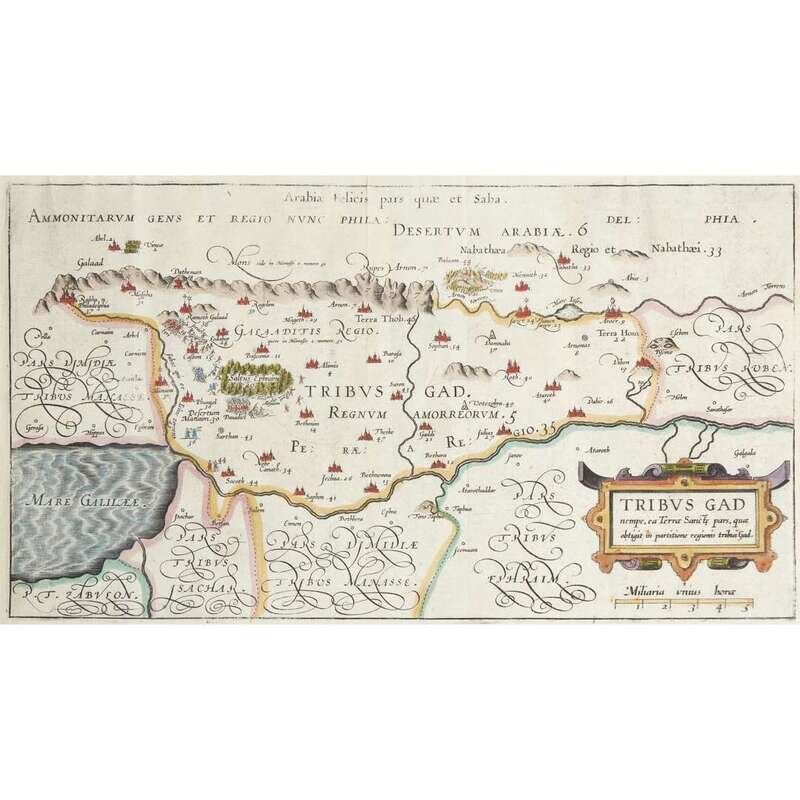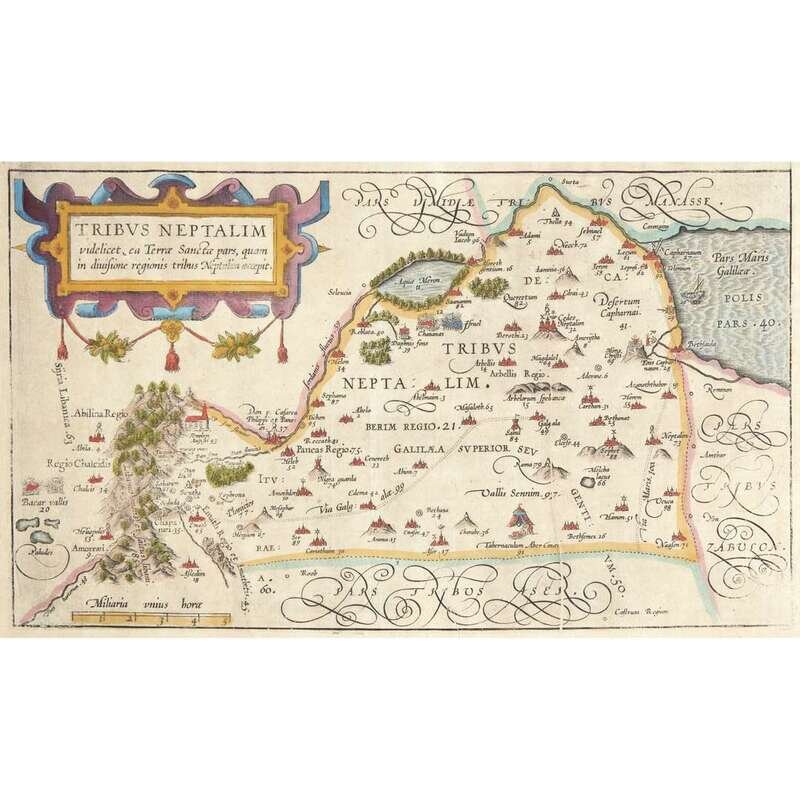 No place, no date (ca. 1590). Five maps of the territories of the Tribes of Israel, including: Tribus Aser, Tribus Gad, Tribus Neptalim, Tribus Ruben, and Tribus Simeon. Hand-colored engravings. Each measuring approximately 10 1/4 x 17 1/2 in. (26 x 44.4cm). Condition varies; each trimmed, and in mat.