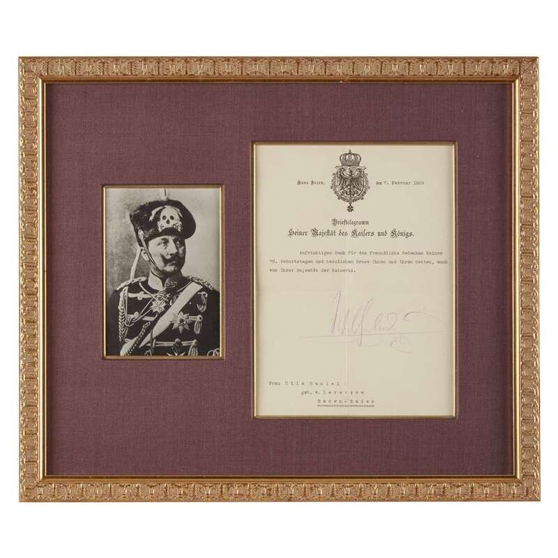 Doorn Castle, (Netherlands), February 7, 1929. 1 p., on imperial stationery. Letter: 10 x 7 1/4 in. (25.4 x 18.4 cm) (sight); frame: 16 1/2 x 19 1/2 in. (42 x 49.5 cm). Typed letter, signed by Wilhelm, to Frau Ulla Haniel of Baden-Baden, [in translation], "My sincerest thanks for your kind wishes on my 70th birthday and warm greetings to you and your husband from myself and also from Her Majesty the Empress", boldly signed in purple pencil. In frame, with photographic portrait of Wilhelm.