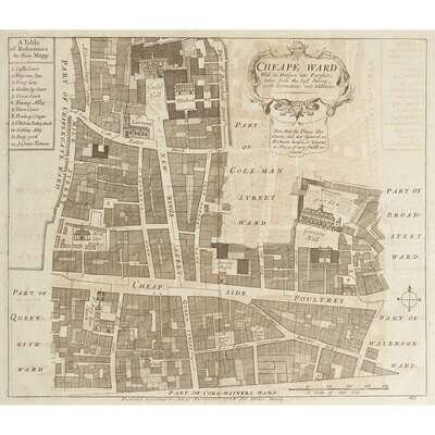 London, 1754-55. Approximately 18 1/2 x 15 7/8 inches. Five matted maps from Stow's "A Survey of Cities of London and Westminster and the Borough of Southwark". Maps include: 1. Cheape Ward 2. Creplegate Ward 3. A Map of St. Giles's Cripple Gate. Without 4. A Map of St Sepulchers Without Charterhouse Liberty and Clarkenwell Parish 5. The Parish of St Johns Wapping...