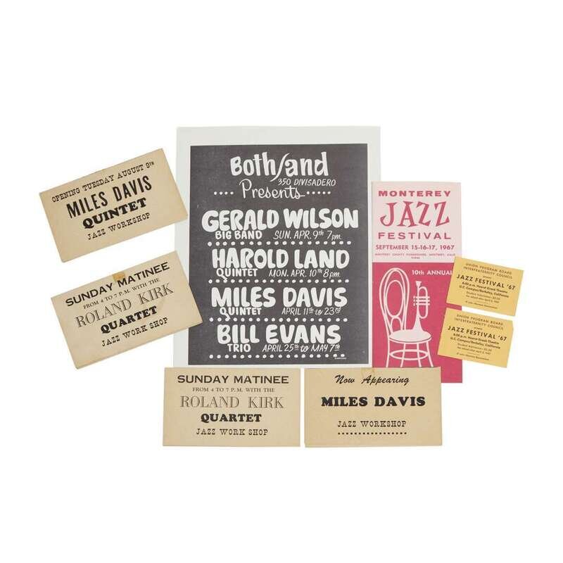 Locations vary, 1960s. Size and condition varies. Includes: Four tabletop folding ads from San Francisco's Jazz Workshop nightclub, circa 1960s). 5 1/2 x 6 1/2 inches (folded size 5 1/2 x 3 1/4 inches). Featuring John Coltrane Quintet/Miles Davis Quintet (1966); Art Blakey/Roland Kirk Quartet (two copies); Miles Davis/Mongo Santamaria. Rare. Pair of ticket stubs to Jazz Festival '67 at U.C. Campus/Berkley, California, (April 8, 1967) Printed poster, 11 x 8 1/2 inches, featuring the Miles Davis Quintet, the Bill Evans Trio, et al., from the both/and (Jazz Club) in San Francisco, April, (1967) Brochure for the Monterey Jazz Festival, September 15-17, 1967.