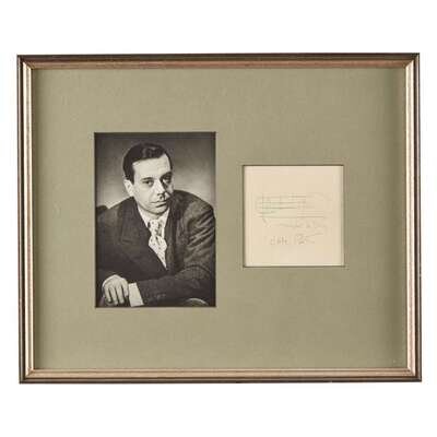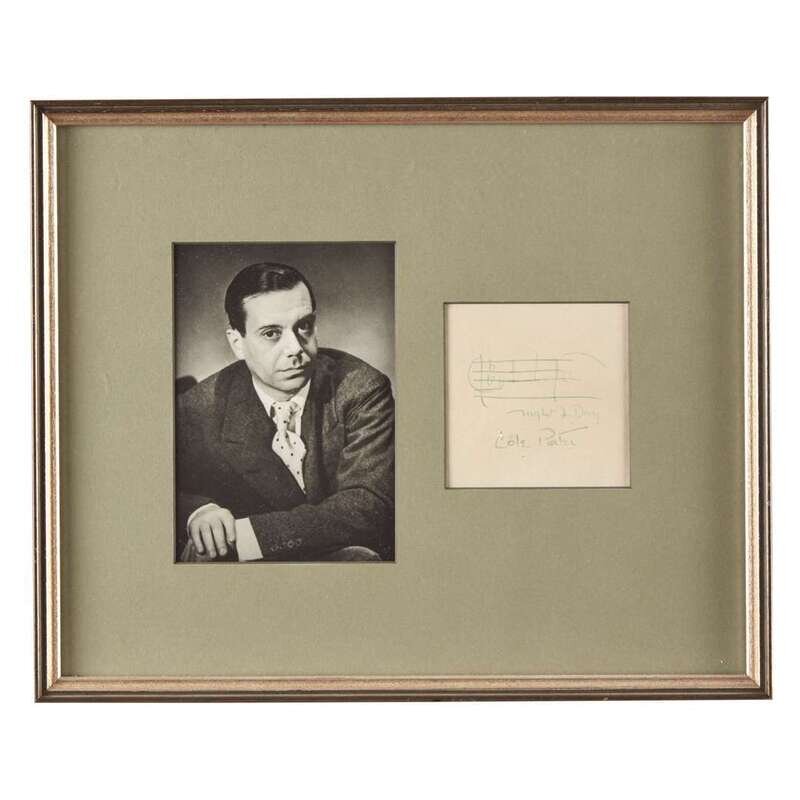 No place, no date. Sheet: 3 3/4 x 3 3/4 in. (sight). Frame: 12 1/4 x 15 in. In green ink, two-bar melody quotation from Porter's 1932 song "Night & Day," signed "Cole Porter". Fine.