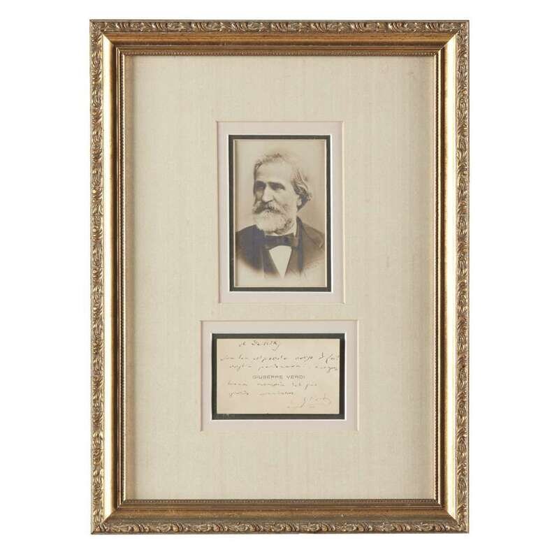 No place, no date. 2 1/2 x 3 1/2 in. Autograph note in Verdi's hand on a calling card printed with "Giuseppe Verdi", inscribed to recto in ink in Verdi's hand and signed "G. Verdi", possibly addressed to a "De Resky", which might refer to either Jean or Edouard de Rezske, both prominent opera singers who often performed Verdi's works.