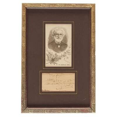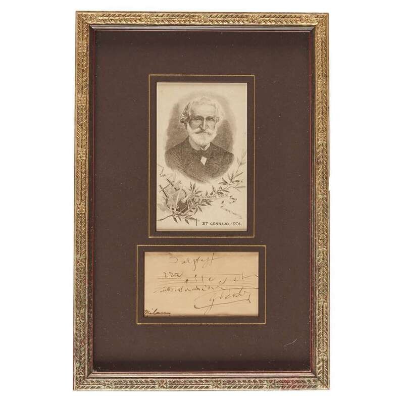 Circa. 1893-95. Musical quotation from his last opera, Falstaff (1893), featuring the two-bar melody “tutto nel mondo e burla” (“everything in the world is a jest”); "Milan/1895" below in an unknown hand. Sheet: 2 1/8 x 3 5/8 in. (sight). Frame: 12 1/4 x 8 1/4 in. Unexamined out of frame.