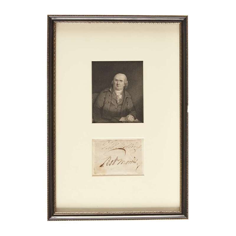 No place, no date. 2 1/4 x 3 in. Boldly signed "Robt. Morris" in ink on vellum, likely cut from a document and also signed by Thomas Willing. With one abrasion traversing the last letter in Morris's signature. Framed with a portrait of Morris.
