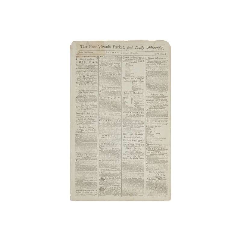 (Philadelphia), Friday, Jan 18, 1788; no. 2794. Folio. 4 pp. Light toning, small areas of discoloration, minor chipping at edges, horizontal crease along center from original fold, tape repairs along same.