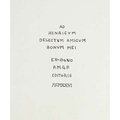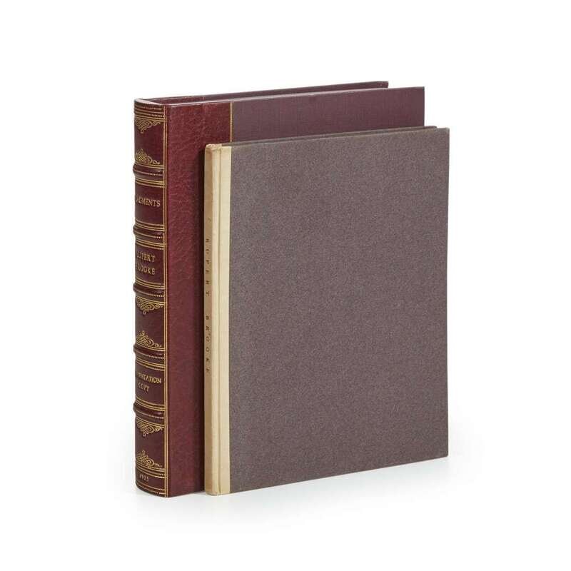 Hartford, 1925. First and limited edition, #15/99 copies printed. 8vo. 23 pp. Inscribed in Latin by Potter on first free leaf. Potter published the first bibliography of Brooke, in 1923. Bound in quarter faux vellum, stamped in gilt, over brown paper-covered boards; top edge trimmed, other edges untrimmed; enclosed in a dark red quarter niger solander box. Keynes 9.