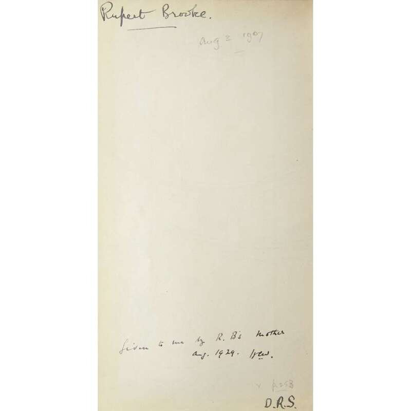 London and New York, 1905. 12mo. 472 pp. Rupert Brooke’s copy and with his ownership signature in ink at top of verso of front free endpaper, with "Aug 3 1907" in pencil beneath same and "Given to me by R. B.'s mother/Aug 1929" at bottom of page. Publisher's flexible brown leather, stamped in gilt; top edge gilt, other edges untrimmed; illustrated endapers; enclosed in a brown quarter morocco box.