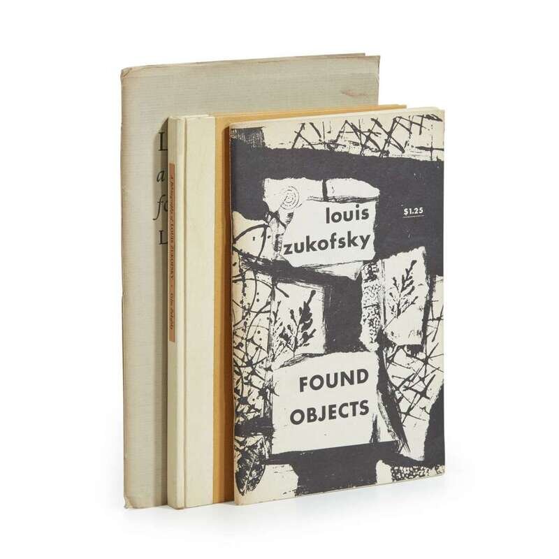 Found Objects Georgetown, Kentucky: H.B. Chapin/A Blue Grass Book (Blue Grass #3), (1964). First edition. 8vo. 43 pp. Cover designed by Dan McIntosh. Original limp wrappers; creasing at bottom corners. Together with: Little, a fragment for careenagers (Los Angeles): Black Sparrow Press, (1967). Limited edition, #86 of 250 copies, signed by Louis Zukofsky. 8vo. (iv), (25), (3) pp. Inscribed by Zukofsky to his publisher Tom Maschler on front free endpaper: "again/all happiness/to/Tom Maschler/from/Louis & Celia/Nov. 17, 1968". From the library of Tom Maschler, and with his book-plate on verso of front wrapper. Original limp green wrappers, faded; offsetting on front free endpaper. Together with: Zukofsky, Celia A Bibliography of Louis Zukofsky Los Angeles: Black Sparrow Press, 1969. First and limited edition, letter M of 20 lettered copies (of a total of 320 copies), signed by Celia and Louis Zukofsky. 8vo. (56) pp. Additionally inscribed by Celia Zukofsky to Louis's publisher Tom Maschler on verso of first free leaf: "Tom Maschler's/copy/with kindest thoughts/Celia/6/1/69". From the library of Tom Maschler, and with his book-plate on front paste-down. Original quarter leather over ochre-yellow paper-covered boards, stamped in black, paper spine label; in acetate wrapper.