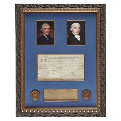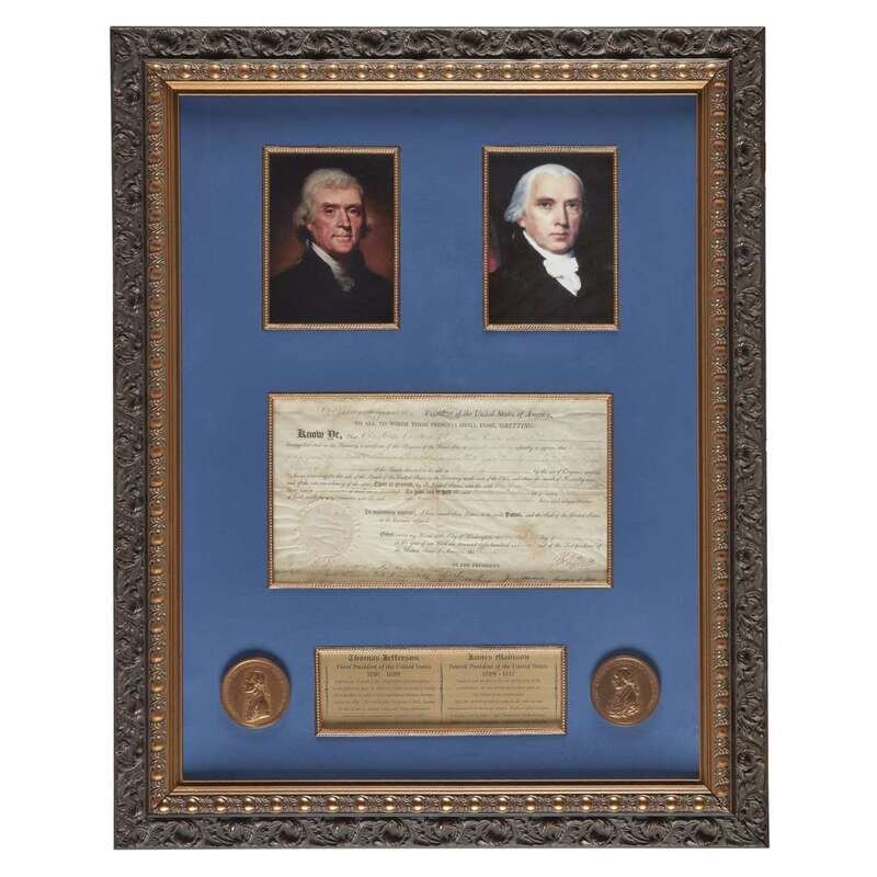 Washington: May 20, 1806. Folio on vellum. Document signed by Thomas Jefferson (“Th. Jefferson”) as President of the United States, countersigned by James Madison as Secretary of State, granting ownership of a quarter lot of land in Ohio to Christian Clinker. With paper seal. Manuscript contents lightly faded, signatures overwritten in an unknown hand at a later date. Window mounted and framed with a descriptive plaque.