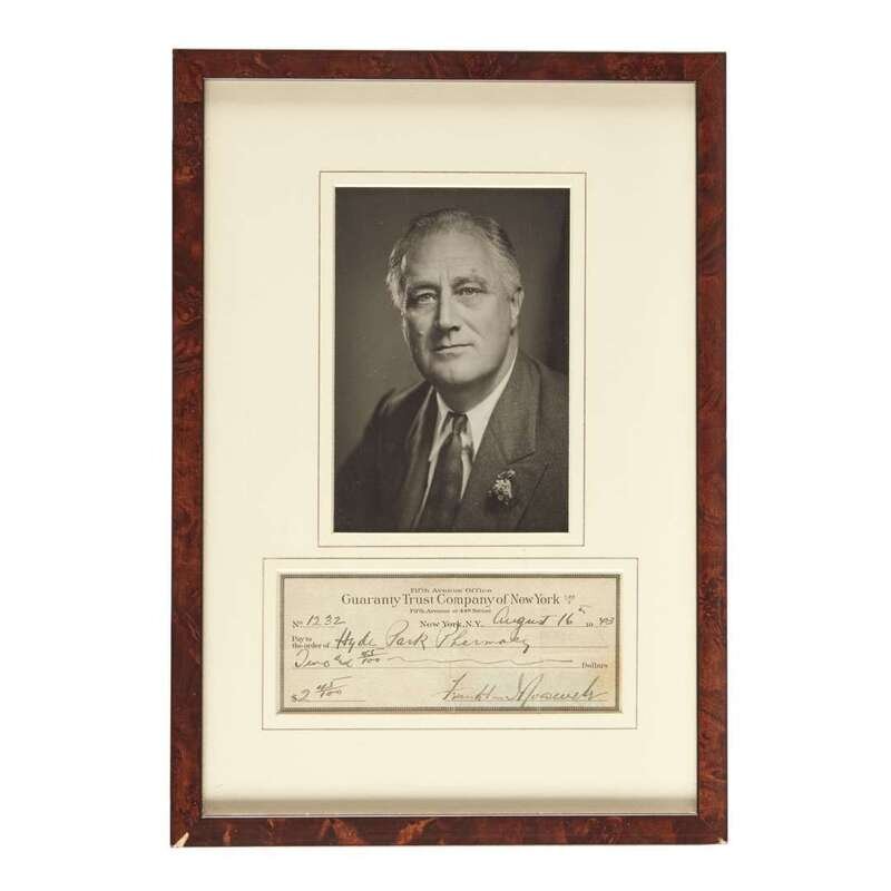 New York: August 15, 1943. 2 3/4 x 6 1/2 in. One check, drawn on the Guaranty Trust Company of New York, made out to Hyde Park Pharmacy for the amount of $2.45. Signed "Franklin Roosevelt" as President in a bold hand. Free of cancellation marks, with a few light creases to old folds and a couple of faint stains. Framed with a photographic portrait of Roosevelt.
