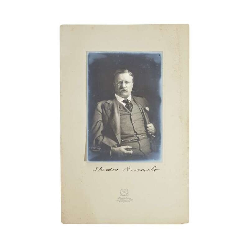 Washington, D.C., 1907. Gelatin silver print depicting a bespectacled Roosevelt in a three-piece suit, mounted to board. Signed "Theodore Roosevelt" in ink below image. With copyright statement of Harris & Ewing in image at bottom left and blindstamped to board. Photograph with light fading to edges, else fine; signature clear and dark; board with some foxing to edges, one closed tear to right edge. Print: 9 1/2 x 6 1/2 in.; board: 17 1/8 x 11 in.