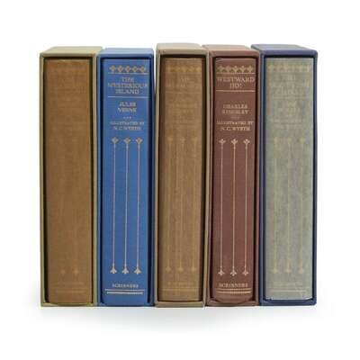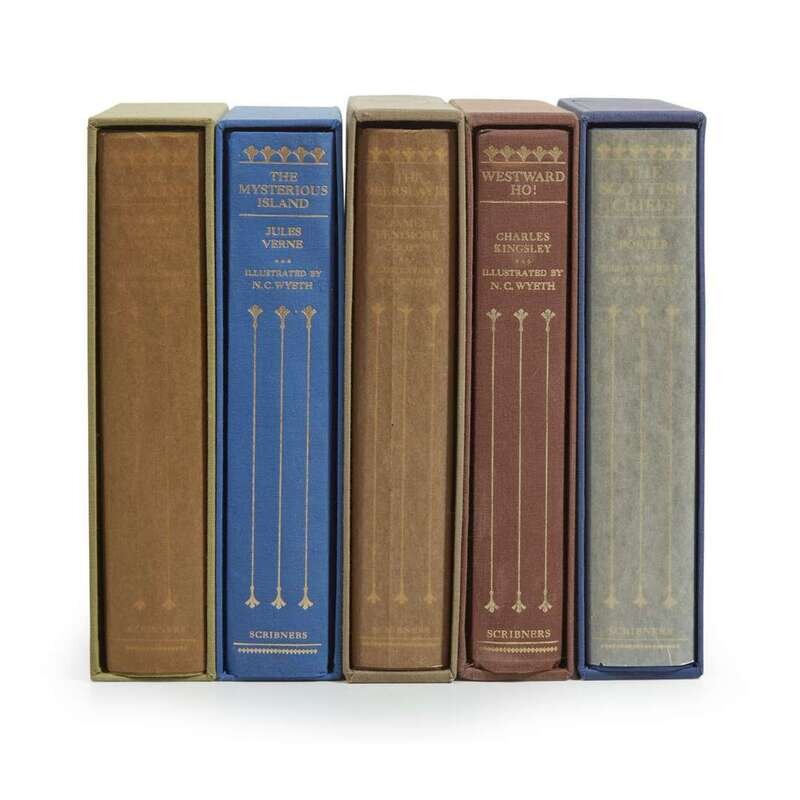 1. Cooper, James Fenimore. The Deerslayer, (1990). Limited edition, #127/150 numbered copies. Illustrated by Wyeth. Brown cloth-covered boards, illustrated paper cover label; glassine dust-jacket; in slip case. 2. Kingsley, Charles. Westward Ho!, (1990). Limited edition, #89/150 numbered copies. Illustrated by Wyeth. Brown cloth-covered boards, illustrated paper cover label; lacking glassine dust-jacket; in slip case. 3. Porter, Jane. The Scottish Chiefs, (1991). Limited edition, #8/150 numbered copies. Illustrated by Wyeth. Blue cloth-covered boards, illustrated paper cover label; glassine dust-jacket; in slip case. 4. Rawlings, Marjorie Kinnan. The Yearling, (1985). Limited edition, #143/350 numbered copies. Illustrated by Wyeth. Green cloth-covered boards, illustrated paper cover label; glassine dust-jacket; in slip case. 5. Verne, Jules. The Mysterious Island, (1988). Limited edition, #111/250 numbered copies. Illustrated by Wyeth. Blue cloth-covered boards, illustrated paper cover label; lacking glassine; in slip case.