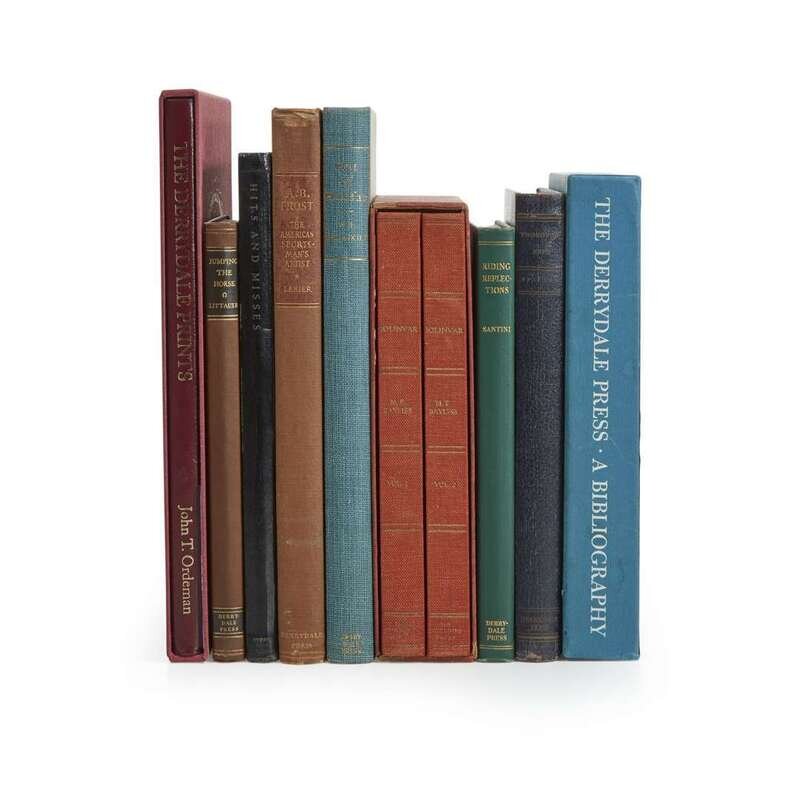 New York; Goshen, Connecticut; Ringwood, New Jersey, 1931-2005. Size and condition vary. Includes: 1. Bayliss, Marguerite F. Bolinvar. In two volumes. #30/950 copies. Inscribed by Bayliss. Siegel 112 2. Brown, Paul. Hits and Misses. #503/950 copies. Signed by Brown. Siegel 93 3. Lanier, Henry Wysham. A. B. Frost: The American Sportsman's Artist. One of 950 copies. Siegel 67 4. Littauer, Captain V.S. Jumping the Horse. One of 950 copies. Siegel 54 5. MacAskill, Wallace R. Out of Halifax: A Collection of Sea Pictures. One of 950 copies. Review copy and so stamped on copyright page beneath colophon, review slip also laid in. Siegel 123 6. Ordeman, John T. The Derrydale Prints. #58/300 signed copies. 7. Santini, Piero. Riding Reflections. One of 850 copies. Siegel 64 8. Siegel, Henry A., et al. The Derrydale Press: A Bibliography. #298/1,250 copies. 9. Spiller, Burton L. Thoroughbred. #121/950 copies. Siegel 106.
