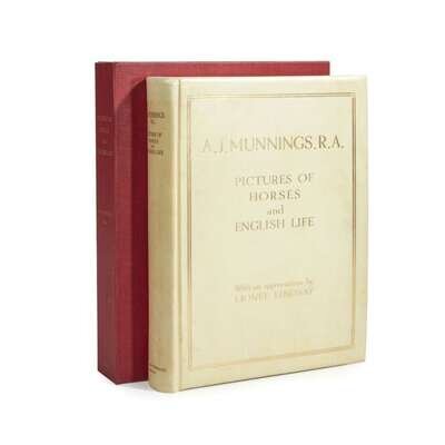 London: Eyre and Spottiswoode Limited/New York: Charles Scribner's Sons, 1927. Limited edition, #149 of 250 numbered copies, signed by Munnings. Illustrated with frontispiece and 27 mounted color plates with captioned tissue guards, as well as 118 black and white plates. Original full vellum-covered boards, stamped in gilt; top edge gilt, other edges untrimmed; marbled endpapers; front and rear endpapers spotted; book-plate on front paste-down; in clamshell box.