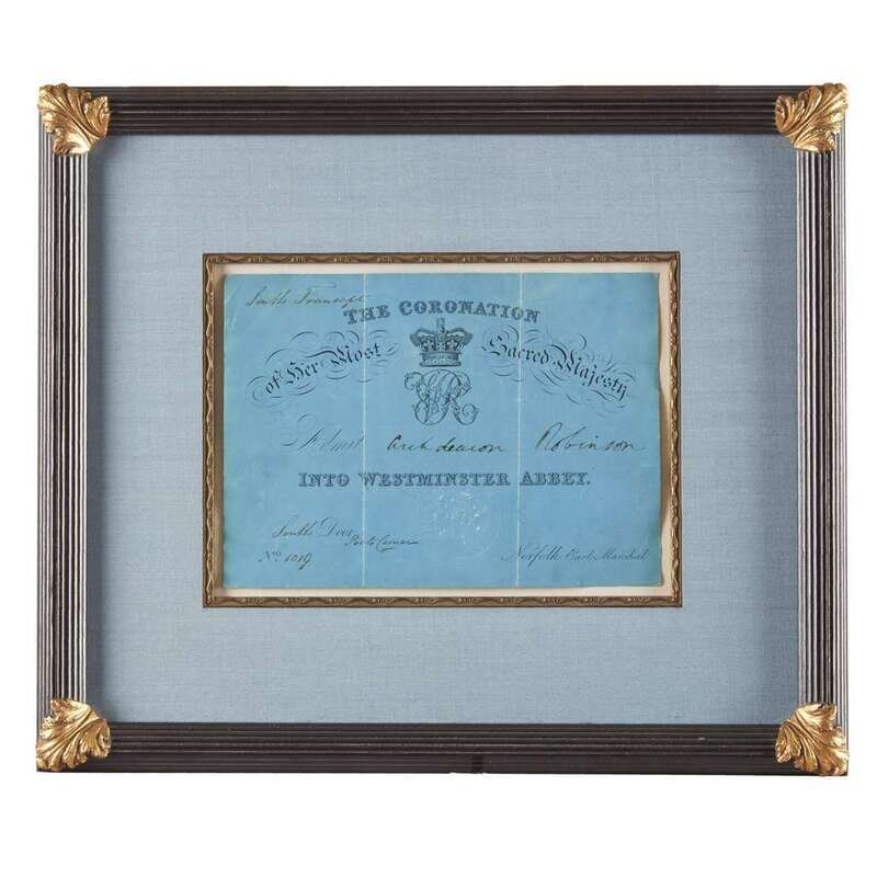 No place, (1837). Printed ticket to the coronation of Queen Victoria for Archdeacon Thomas Robinson (1790-1873), Archdeacon of Madras. 8 7/8 x 6 3/8 inches (sight). Printed in ink on the ticket is the number, "1019" and the instructions "South" (Door), Poets Corner" and "South Transept". With the seal of the Earl Marshal of England, Bernard Edward Howard, 12th Duke of Norfolk. Archivally framed.