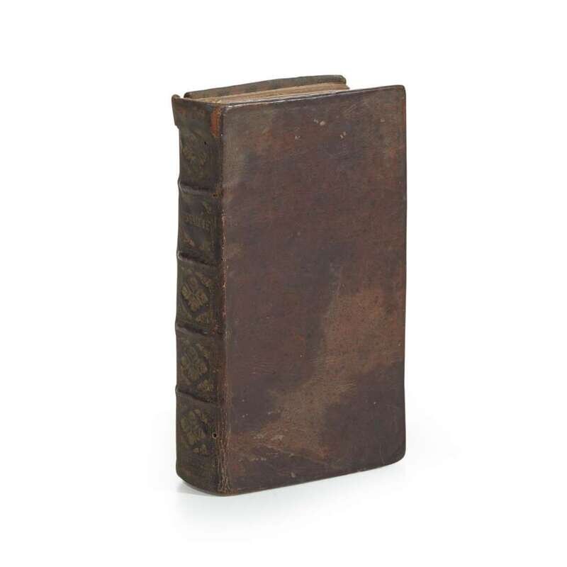 Amsterdam: Henry Desbordes, 1689. “Nouvelle Edition.” 12mo. (12), (516),1-118, (2) (blank) pp. Illustrated with printer’s device on title-page, and 512 pp. of musical notes with French paraphrases. Old full mottled brown calf, stamped in gilt, corners and spine ends rubbed; some darkening to blanks, minor dampstaining at rear, rear paste-down sprung. OCLC 221575816.