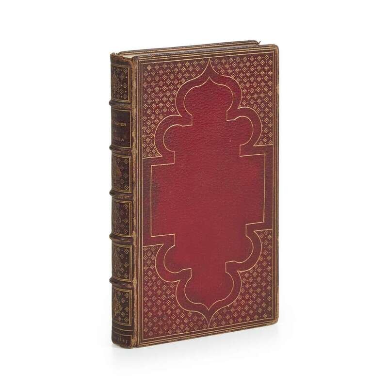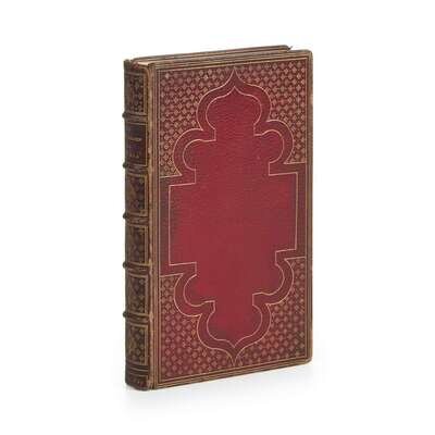 London: Longman, Brown, Green & Longmans, 1845. First edition. 12mo. (2), xvi, (2), 193, (1) pp. Elaborately illustrated with an additional ornamental title-page, gilt decorated section titles, and red ornamental border designs. Full red morocco, elaborately stamped in gilt with a Persian motif, edges and spine darkened, spine ends, joints, and corners rubbed; all edges gilt; offsetting to free endpapers, offsetting on title-page and first few leaves; by S. Kaufmann.