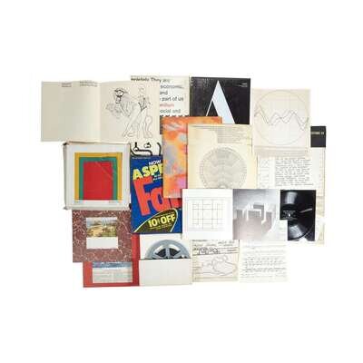 New York: Roaring Fork Press, 1965-71. Issues 1-9. Multimedia, size and format vary. Includes: Issue 1: The Black Box. 1965. Complete, including eight items in various formats; in black box. Designed by George Lois, Tom Courtos, and Ralph Tuzzo. Objects include, but not limited to, phonograph jazz album, Denis Higgins and John Henry Auran on cross-country skiing, and contributions and papers from the 15th annual International Design Conference in Aspen. Box lightly worn. Issue 2: The White Box. 1966. Complete, including six items in various formats; in white box. Designed by Frank Kirk, with Tony Angotti. Objects include, but not limited to, phonograph recording of works by composer Alexander Scriabin, Martin Luray on downhill skiing, and excerpts from various writers from the Aspen Film Conference. Box slightly worn. Issue 3: The Pop Art Issue. December, 1966. Complete, including 10 items and loose ads in various formats; in Warhol-designed imitative Fab detergent box. Designed by Andy Warhol and David Dalton. Objects include, but not limited to, John Cale and Peter Walker phonograph, twelve cards depicting paintings from the Thomas Powers collection, Andy Warhol and Jack Smith flipbook, excerpts from the Berkeley Conference on LSD, and Warhol's printed newspaper "The Plastic Exploding Inevitable." Light wear to box. Issue 4: The McLuhan Issue. Spring, 1967. Lacking subscription form, else complete. Including eight items in various formats; in box. Designed by Quentin Fiore. Objects include, but not limited to, Mario Davidovsky and Gordon Mumma phonograph, "Diary: How to Improve the World (You Will Only Make Matters Worse)" by John Cage, poster by Marshall McLuhan and Quentin Fiore, and excerpts from "The Bikeriders" by Danny Lyon. Box lightly worn. Issue 5 & 6: The Minimalism Issue. Fall/Winter, 1967. Lacking two pieces in ads folder (checklist of Something Else Press books and Great Bear pamphlets, and brochure for Bolex super-8 projectors), else complete in 27 pieces in various formats; in two-piece white box. Edited and designed by Brian O'Doherty, art direction by David Dalton and Lynn Letterman. Objects include, but not limited to, one reel of Super 8 film with short films by Robert Rauschenberg, Laszlo Moholy-Nagy, Hans Richter, and others, musical scores by Morton Feldman and John Cage, installation schematics by Sol Lewitt, five phonographs, and block puzzle pieces. Issue 6A: The Performance Art Issue. Winter 1968-69. Complete, including 14 items in various formats; in original mailing envelope. Edited by Jon Hendricks. Objects include, but not limited to, notes on a performance by Allan Kaprow, notes for a performance by Nam June Paik, and notes for a performance by Carolee Schneemann. Envelope worn. Issue 7: The British Issue. Spring/Summer 1970. Lacking order form, else complete, including 13 items in various formats; in Richard Smith-designed box. Edited by Mario Amaya, and designed by John Kosh. Objects include, but not limited to, facsimile pocket diary by John Lennon, phonograph by Lennon and Yoko Ono, coloring book by Eduardo Paolozzi, and drawings by David Hockney. Box worn. Issue 8: The Fluxus Issue. Fall/Winter 1970-71. Published by Aspen Communications, Inc. Lacking subscription form, else complete, including 13 items in various formats; in printed folder. Edited by Dan Graham, and designed by George Maciunas. Objects include, but not limited to, La Monte Young and Jackson LacLow phonograph, notes on sculptural projects by Richard Serra, descriptions of land art works by Dennis Oppenheim and Robert Morris, and text by Robert Smithson. Folder toned, with light edge wear. Issue 9: The Psychedelic Issue. Winter/Spring 1971. Lacking subscription form and phonograph recording "Audio: Joyous Lake / Spontaneous Sound," else complete, including 13 items, in various formats; in Hetty MacLise-designed folder. Objects include, but not limited to, stamps by Don Snyder, calligraphic designs by Marian Zazeela, La Monte Young on oneiric music, and music score by Terry Riley. Folder slightly worn and creased.