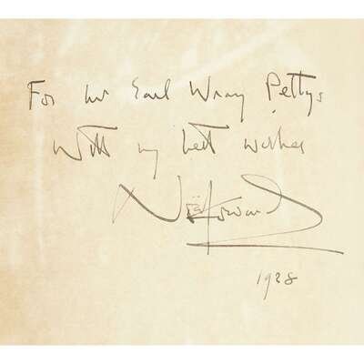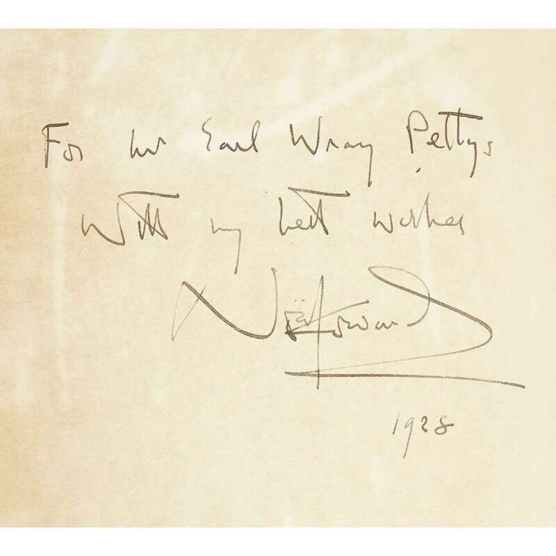 London: Ernest Benn, Limited, 1925. First edition. 8vo. (xviii), 9-(278), (3) (ads) pp. Inscribed by Coward on front free endpaper: "For Mr. Earl Wray Pettys/With my best wishes/Noel Coward/1928". Illustrated with photographic frontispiece portrait of Coward. Original green cloth, stamped in gilt, spine ends lightly rubbed, corners very lightly worn; all edges trimmed; front and rear hinge worn; in green quarter goatskin solander box.