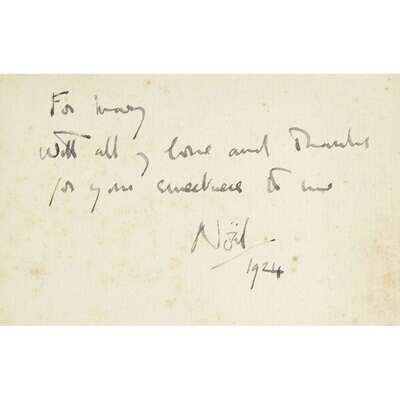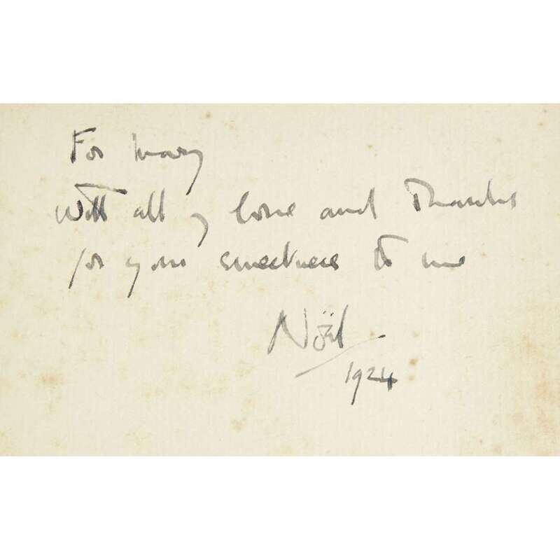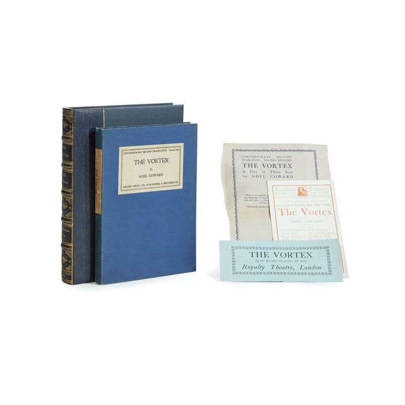 London: Ernest Benn, Limited, 1925. First edition. 8vo. (106), (1) (ads) pp. Inscribed by Coward to cast member Mary Robson on front free endpaper: "For Mary/With all, love and thanks/for your sweetness to me/Noel/1924". Front panel of original dust-jacket laid in, as well as a printed ad for the play's tryout at the Everyman Theatre in Hampstead, and the original printed wraparound band from the book: "THE VORTEX/NOW BEING PLAYED AT THE/ROYALTY THEATRE, LONDON". Original blue cloth, printed paper labels on cover and spine, toned; all edges trimmed; endpapers lightly spotted; in blue quarter goatskin solander box.