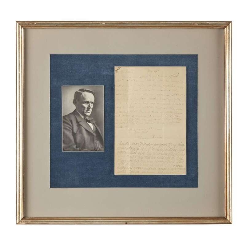 No place: May 28th, no year. 1 p. autograph letter, signed "Clarence Darrow" and addressed to "My dear Blair," also with an autograph note signed by Darrow's wife, Ruby. Light creasing from old folds, ink moderately faded. In frame with a photographic portrait of Darrow.