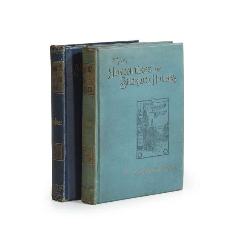 London: George Newnes, Limited, 1892. First edition, first state (with uncorrected text, and blank street sign on front cover). 8vo. (iv), 317 pp. Original light blue cloth-covered beveled boards, faded, a bit soiled, spine slightly darkened, stamped in black and in gilt; all edges gilt; floral patterned endpapers; gutter worn at pp. 144-45, hinge starting at rear. Green and Gibson A10a. Together with: The Memoirs of Sherlock Holmes London: George Newnes, Limited, 1894. First edition. 8vo. (vi), 279 pp. Illustrated with frontispiece and numerous in-text illustrations by Sidney Paget. Original dark blue cloth-covered beveled boards, scattered wear and soiling, front joint rubbed, spine ends rubbed, stamped in black and in gilt; all edges gilt; floral patterned endpapers; scattered minor spotting; in slip case and chemises with above volume. Green and Gibson A14a.