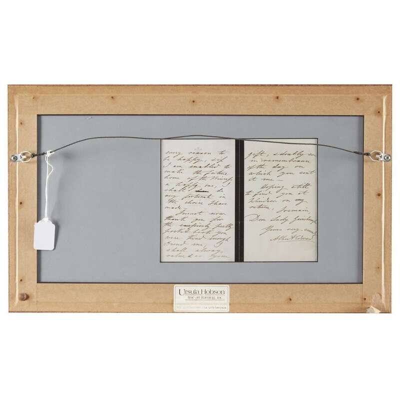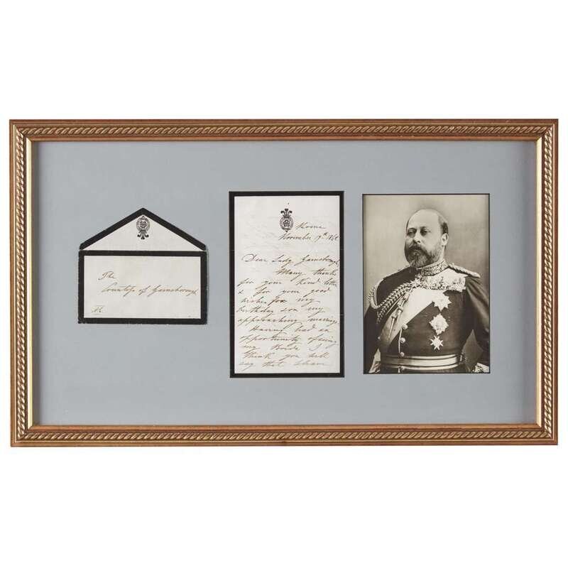November 17, 1862. 3 pp. on the Prince of Wales's mourning stationery. Autograph letter, signed Albert Edward, as Prince of Wales, to the Countess of Gainsborough, thanking her for her letter sending him birthday wishes and congratulations on his approaching marriage to Alexandra of Denmark. 12 1/2 x 20 1/2 in. (31.7 x 52 cm). In frame, with original postal envelope, and photographic portrait of Edward.