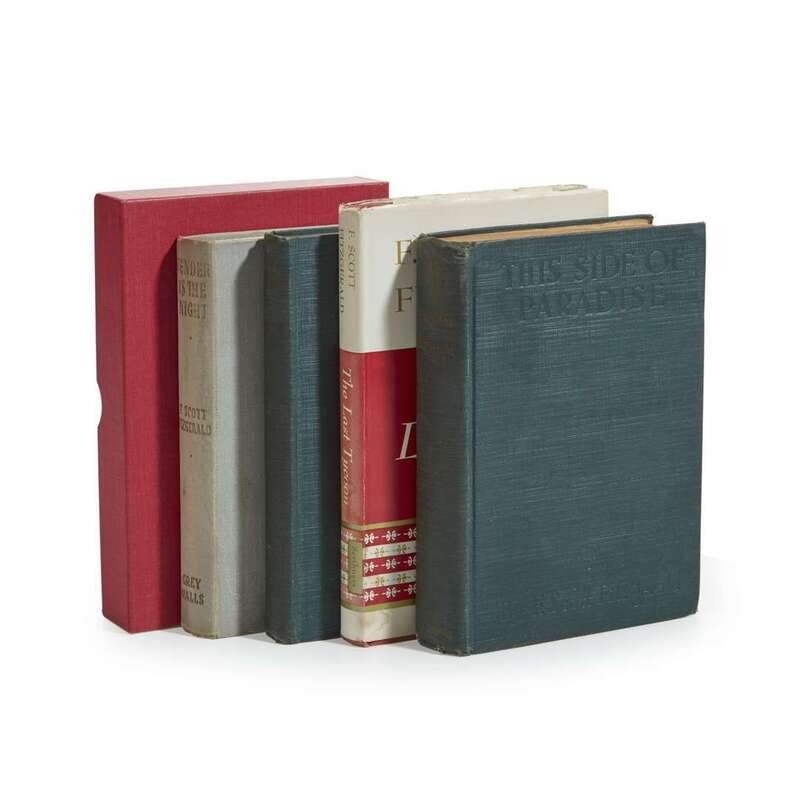 1. This Side of Paradise New York: Charles Scribner's Sons, 1920. Ninth printing. 8vo. (x), 305, (5) pp. Original dark green cloth, stamped in gilt, cocked, soiling on front and rear boards, cloth bubbling on spine, spine ends lightly frayed, corners lightly worn; all edges trimmed; light spotting on endpapers, scattered short closed tears to text edges; lacking dust-jacket. Bruccoli A5.1.i. 2. The Vegetable New York: Charles Scribner's Sons, 1923. First edition, first printing. 8vo. (viii), 145, (1), (2) pp. ads, (4) pp. Original dark green cloth, stamped in blind and in gilt, spine and edges lightly darkened, faint spotting on front and rear boards, gilt faded; all edges trimmed; gutter worn at pp. 24-25, last four leaves unopened; book-plate on front paste-down; lacking dust-jacket. Bruccoli A10.1.a 3. Tender is the Night London: The Grey Walls Press Ltd., (1948). Second English edition. 8vo. 278, (2) pp. Inscribed to Fitzgerald's former Princeton roommate and executor to his estate, Jack Biggs, on front free endpaper in an unknown hand. Original gray cloth, stamped in gilt, spine and gilt faded, scattered soiling on front and rear boards, corners bumped; all edges trimmed; lacking dust-jacket; in red cloth-covered fall-down-back box. Bruccoli A15.4 4. The Last Tycoon New York: Charles Scribner's Sons, (1958). First edition thus. 8vo. x, 163, (3) pp. Original red cloth, stamped in gilt, soiling on spine and rear board; all edges trimmed; in original dust-jacket, dampstaining on spine, rear panel, and rear flap, light edge wear. Bruccoli A19.1.h.