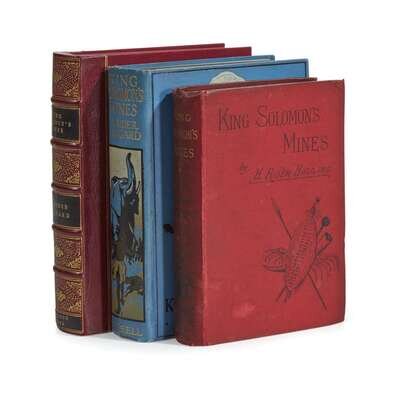 London, etc: Cassell & Company, Limited, 1885. First edition, first issue (with uncorrected text, and ads labeled "5 G. 8.85" and "5 B. 8.85" at rear). 8vo. 320, 16 (ads) pp. Illustrated with folding color frontispiece map, and one in-text map on p. 27. Original red cloth, stamped in gilt and in black, cocked, spine and front board edges darkened, soiling on front and rear boards, spine ends a bit rubbed and chipped, corners lightly worn; all edges trimmed; front and rear hinges worn, several gatherings starting, rear ads partially unopened; small morocco book-plate on front paste-down; in gilt decorated niger solander box; with morocco book-plate in lid. Together with: King Solomon's Mines London, etc: Cassell and Company, Ltd, no date (ca. 1912). Reprint. 8vo. (xvi), 333, (3) pp. Illustrated with frontispiece and three plates by A.C. Michael. Original blue pictorial cloth, stamped in gilt, brown, white, and tan, cocked, scattered light spotting, spine ends very lightly worn; top edge stained blue, other edges trimmed; school prize label on front paste-down.