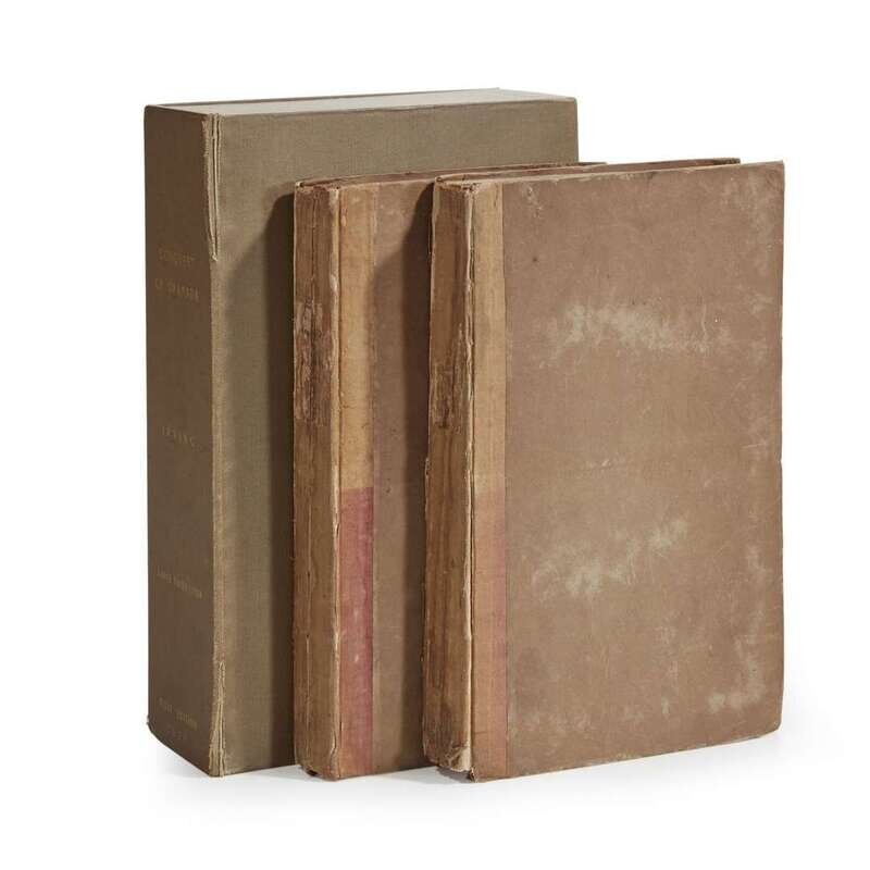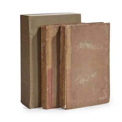 Philadelphia: Carey, Lea & Carey, 1829. In two volumes. First edition, large paper issue. 8vo. 311, 4 (ads); 319 pp. Original quarter purple cloth over boards, boards and edges rubbed, corners moderately worn, spine splitting on first volume, split on second volume but original cords holding, spine ends chipped, remnants of original printed paper labels on each spine; all edges untrimmed; pp. 139/140 repaired in first volume, scattered light foxing to text in each volume, moderate to heavy foxing at pp. 170-176 in first volume; in clamshell box. BAL 10125.